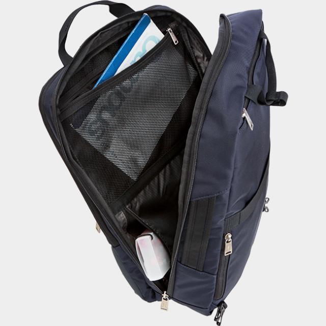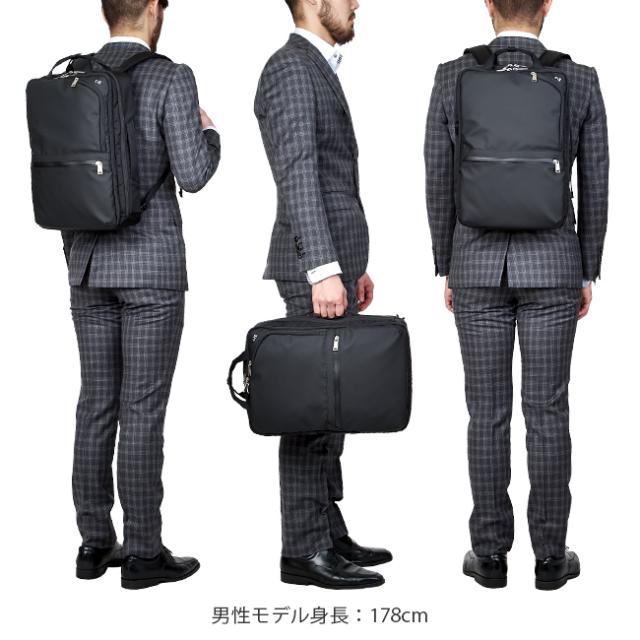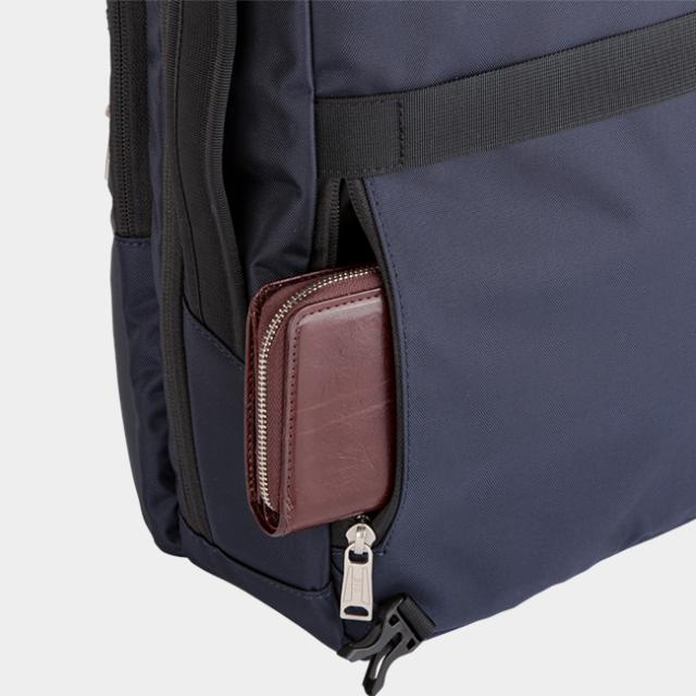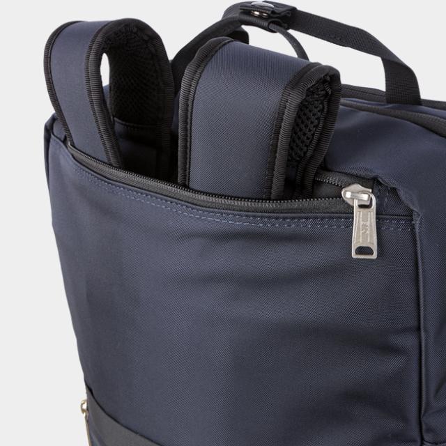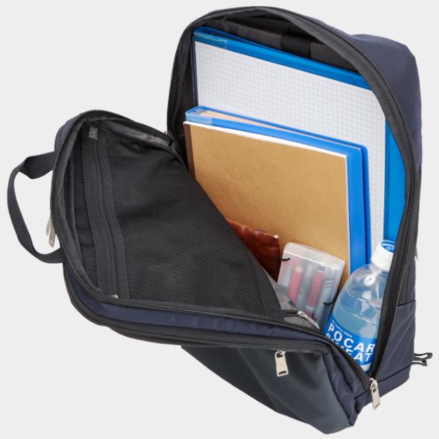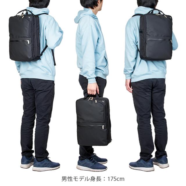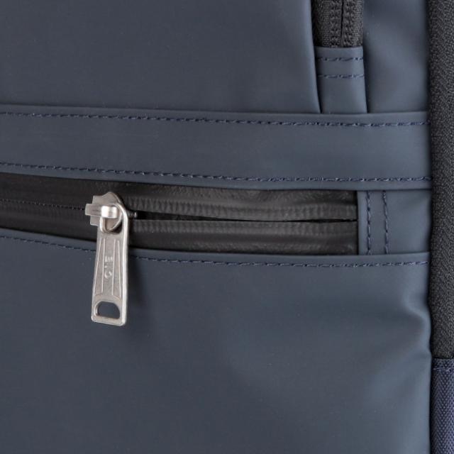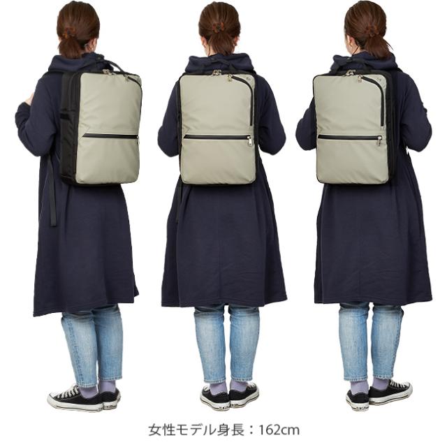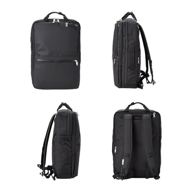 | 本体素材に防水性を高めた生地を使用。そして、生地はもちろん、付属のパーツも軽量なものを使用しているのでバッグ全体が軽量になるように配慮された設計になっています。軽いので女性も安心して使用できるアクティブに動き回れるバッグとなっており、突然の雨にも対応できます。 ビジネスシーンに対応できるように、ノートPCスリーブや収納ポケットを多数施したバックパック。2気室なので書類やファイルの仕分けに優れており、スマートな見た目でありながら、収納容量もたっぷり確保。メイン収納はL字開閉が可能。横持ちで使用していても開閉がしやすい設計です。フロント上下にサイズ感の異なるポケット、バックサイドに長財布が入るサイズ感のファスナーポケットを施しています。スーツケースにキャリーオンが可能なので、旅行や出張の際にも使用が可能となっています。 |