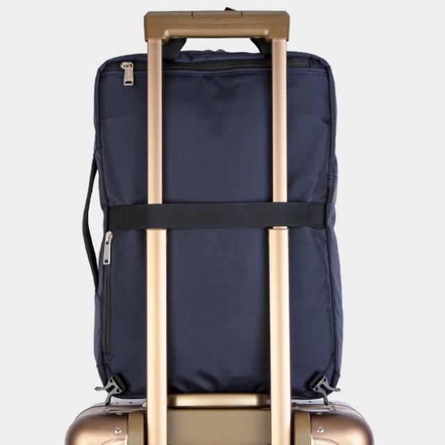 | フロントに上下サイズ感の異なるポケットがあり、上部にキーフック、下部は止水ファスナー仕様です。 | スーツケースに乗せることができます。旅行や出張のお供としても活躍できます。 |
