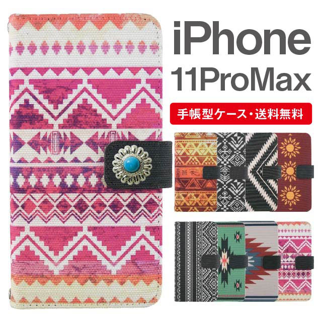 スマホケース 手帳型 iPhone 11 Pro Max アイフォン 携帯ケース カバー 送料無料 キャンバス オルテガ柄 ネイティブ エスニック エジプト コンチョ付き agesugi_ssm