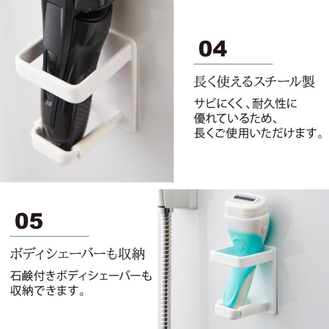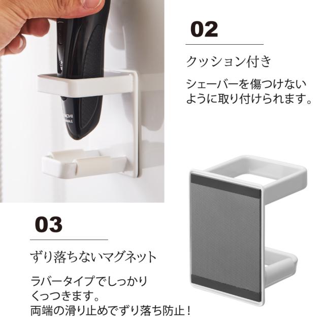 マグネットで好きな位置に設置できる電動シェーバーホルダー。置き場所に困る電動シェーバーを壁面に収納。