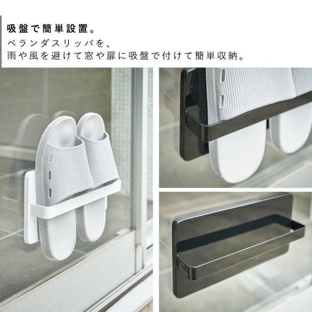 雨や風を避けてベランダスリッパを窓や扉に吸盤で付けて簡単収納。付属の木ネジで壁にも取り付けられます。ベランダの外側に取り付けても便利です。