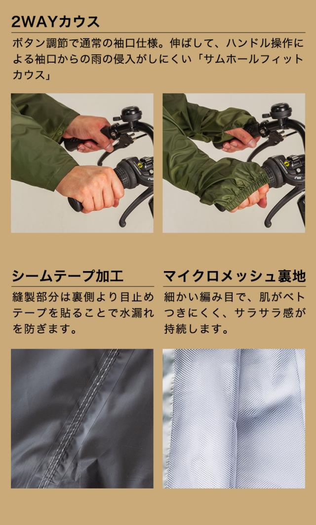 ・2WAYカウス:ボタン調整で浮乗の袖口仕様、伸ばしてハンドル操作による袖口からの雨の侵入がしにくい。