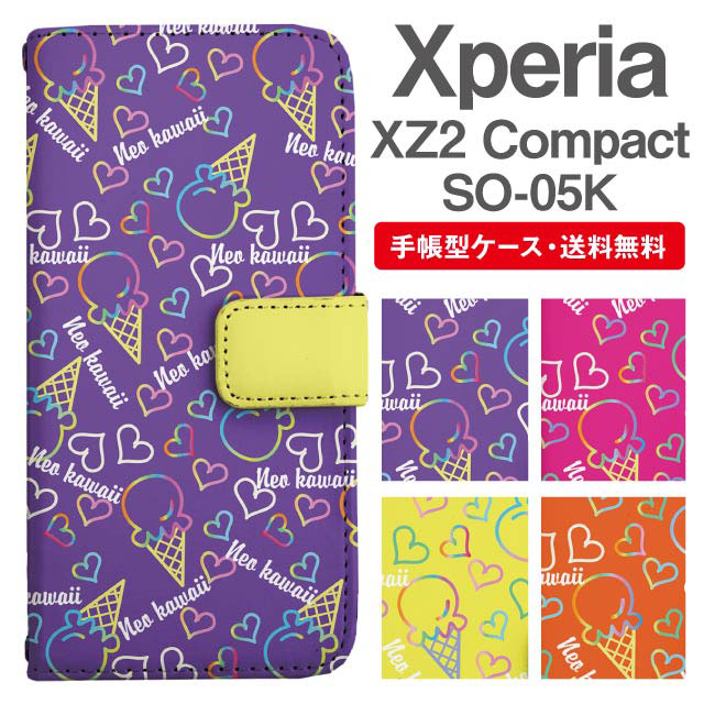 スマホケース 手帳型 Xperia XZ2 Compact エクスペリア SO-05K 携帯ケース カバー 送料無料 スイーツ柄 アイスクリーム ハート ネオン柄 agesugi_ssm