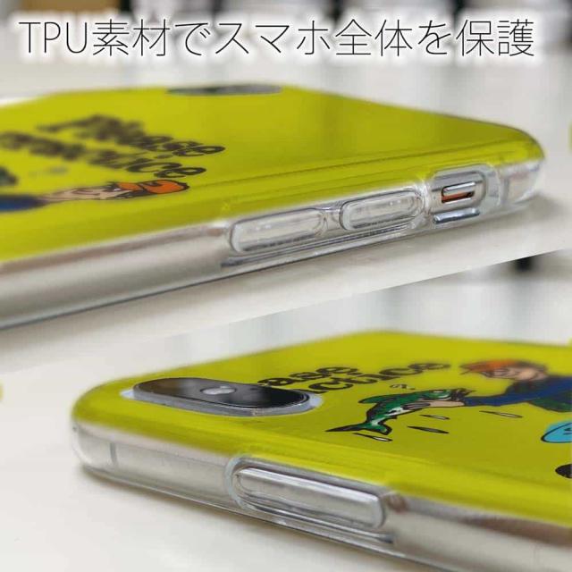 | ケースの素材について | 側面はゴムのように柔らかいTPU素材で、スマホ本体を守ります。万が一の落下でもケースが割れることがなく、耐久性の高いケースとなります。クリア(透明)のTPUケースにプリントしていますので、スマホ本体のカラーを活かしながらデザインケースが楽しめます。 |
