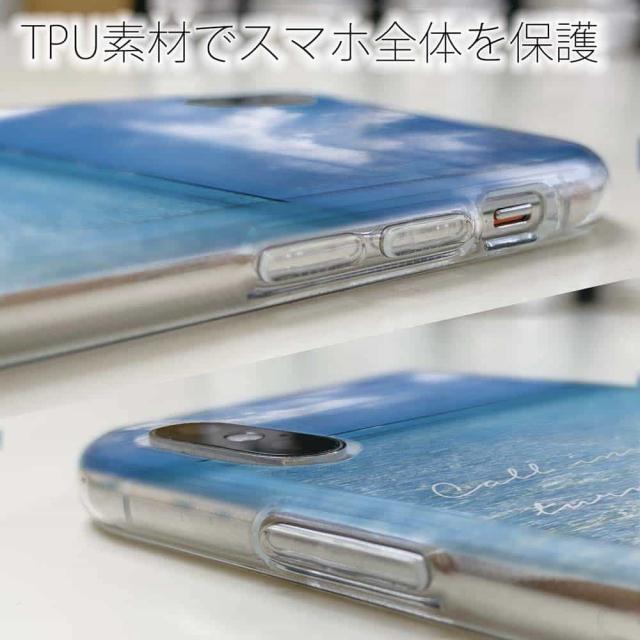 | ケースの素材について | 側面はゴムのように柔らかいTPU素材で、スマホ本体を守ります。万が一の落下でもケースが割れることがなく、耐久性の高いケースとなります。クリア(透明)のTPUケースにプリントしていますので、スマホ本体のカラーを活かしながらデザインケースが楽しめます。 |