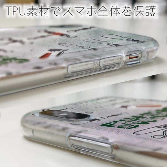 | ケースの素材について | 側面はゴムのように柔らかいTPU素材で、スマホ本体を守ります。万が一の落下でもケースが割れることがなく、耐久性の高いケースとなります。クリア(透明)のTPUケースにプリントしていますので、スマホ本体のカラーを活かしながらデザインケースが楽しめます。 |