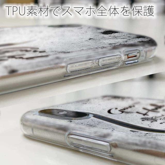 | ケースの素材について | 側面はゴムのように柔らかいTPU素材で、スマホ本体を守ります。万が一の落下でもケースが割れることがなく、耐久性の高いケースとなります。クリア(透明)のTPUケースにプリントしていますので、スマホ本体のカラーを活かしながらデザインケースが楽しめます。 |