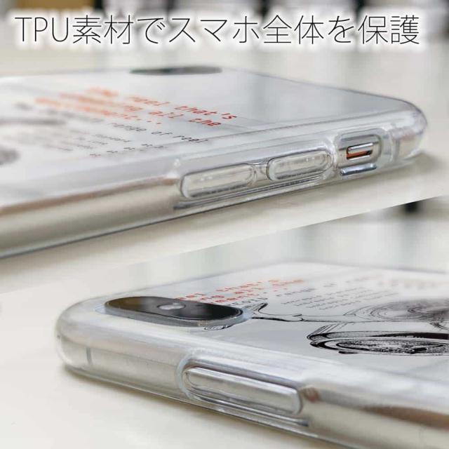 | ケースの素材について | 側面はゴムのように柔らかいTPU素材で、スマホ本体を守ります。万が一の落下でもケースが割れることがなく、耐久性の高いケースとなります。クリア(透明)のTPUケースにプリントしていますので、スマホ本体のカラーを活かしながらデザインケースが楽しめます。 |