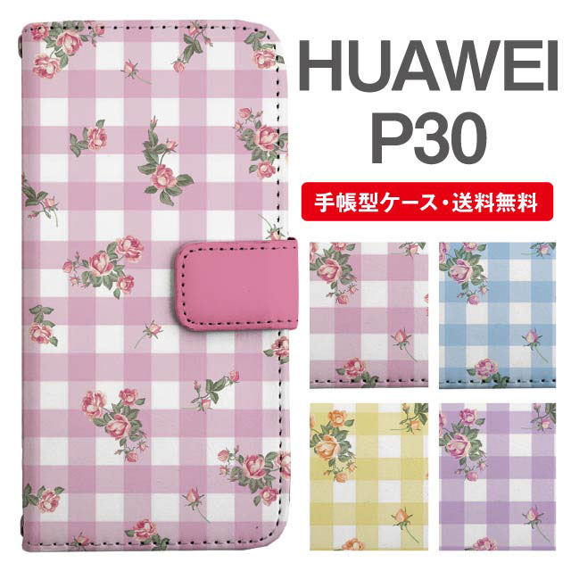 スマホケース 手帳型 HUAWEI P30 ファーウェイ 携帯ケース カバー 送料無料 花柄 フラワー ギンガムチェック agesugi_ssm