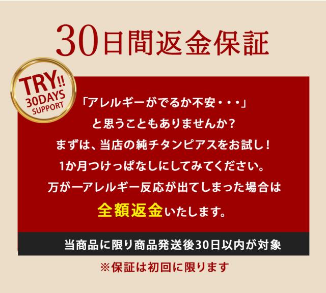 | あり 純チタン製 ※純チタンは被膜により表面が大変滑らかなため、ステンレス等に比べるとキャッチがゆるめになります。 セカンドピアスとしてつけっぱなしにされる方や心配な方は、別売りの「落ちないキャッチ」をご利用ください。 →落ちないキャッチはこちら |