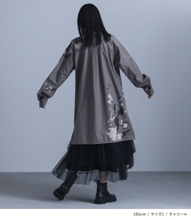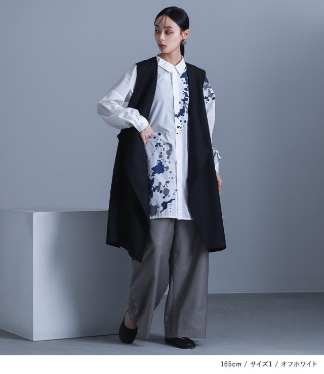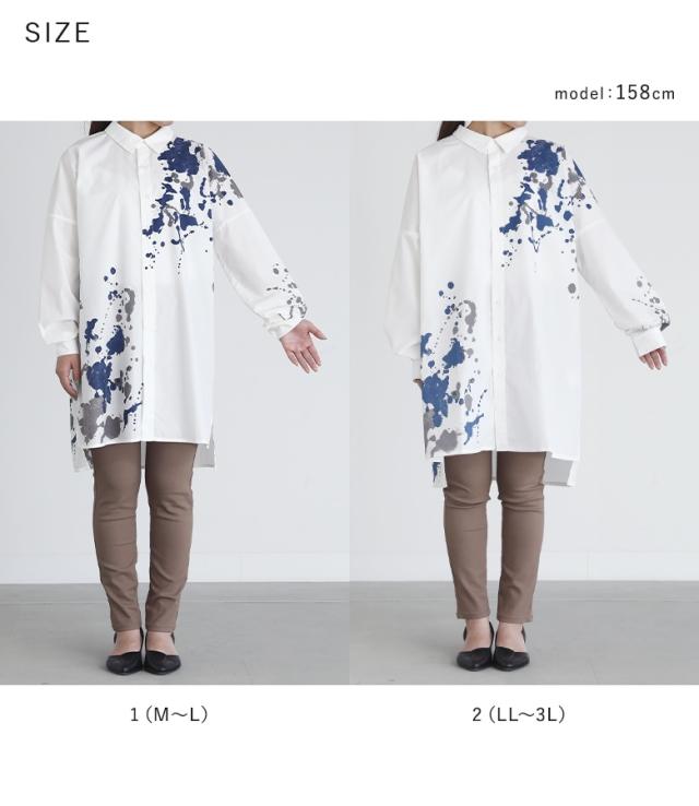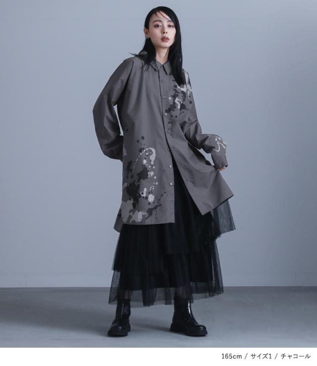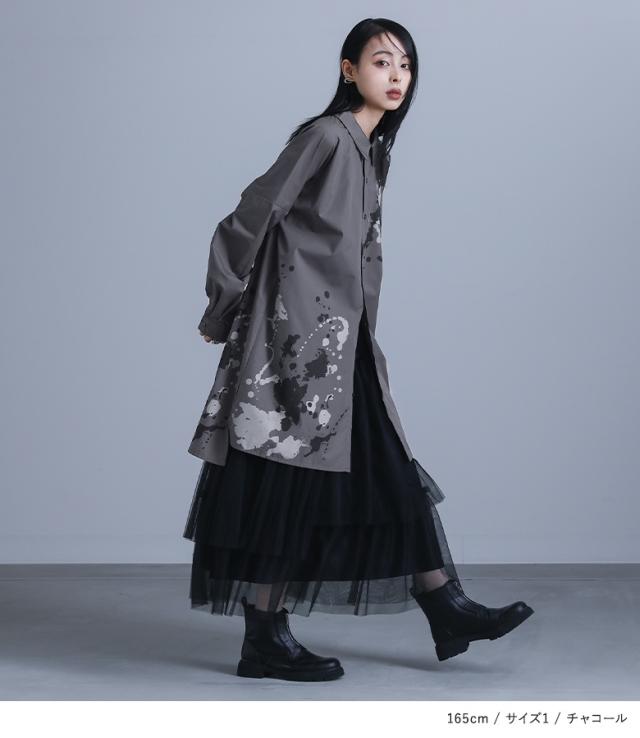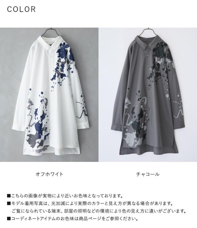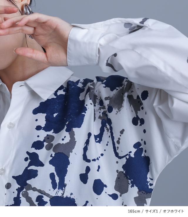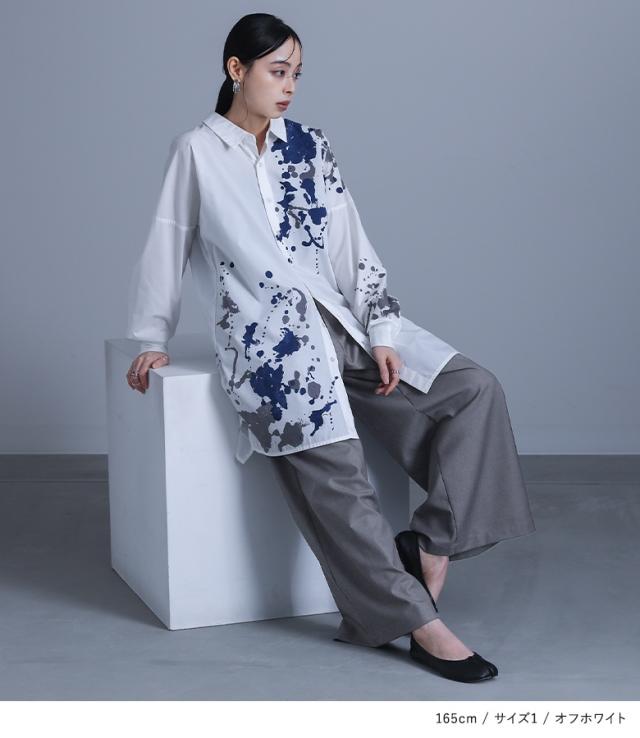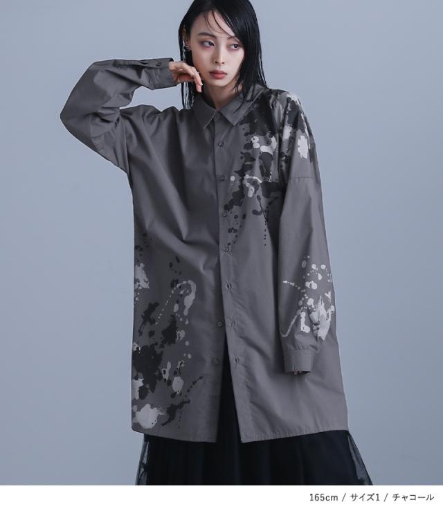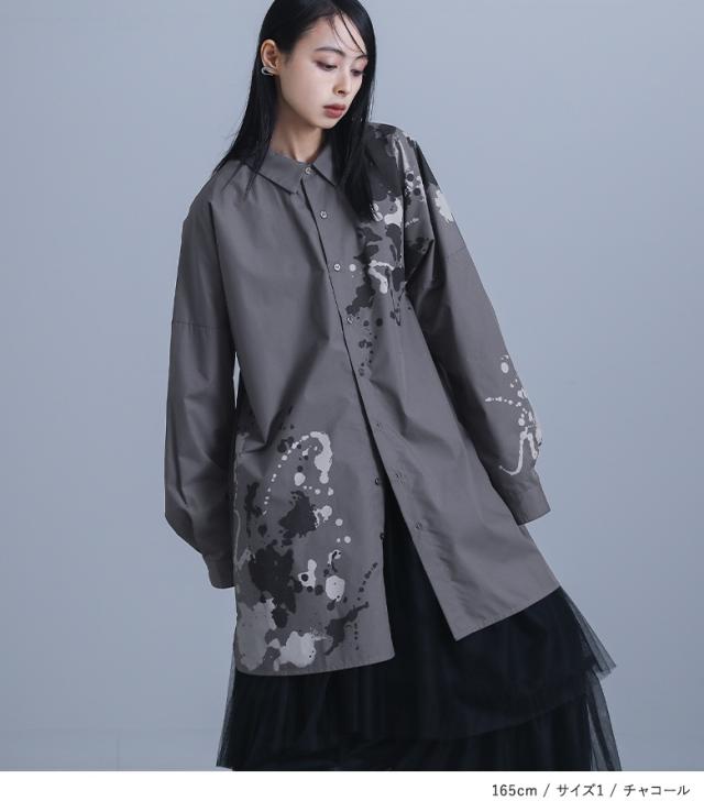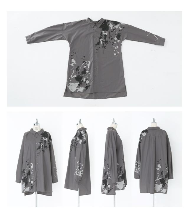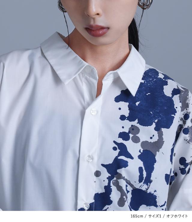 レディース トップス ブラウス シャツ 前開き 襟付きシャツ 抜き襟 長袖 ロング丈 タック ドロップショルダー アシンメトリー アシメ スリット サイドスリット 配色 ペイント柄 プリント スプラッシュペイント 絵具風 ユニセックス おうちで洗える 薄手 涼しい 春夏秋冬 オールシーズン カジュアル 大人女子 大人可愛い モード かっこいい Mサイズ Lサイズ LLサイズ 3Lサイズ ぽっちゃり 体型カバー 大きいサイズ kOhAKU コハク ホワイト 白 オフホワイト チャコール グレー 灰色 【トップス】[ID]tdk0178[kOhAKUスプラッシュペイントシャツ]