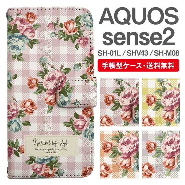 スマホケース 手帳型 AQUOS sense2 アクオス SH-01L SHV43 SH-M08 携帯ケース カバー 送料無料 花柄 フラワー ローズ バラ ギンガムチェック agesugi_ssm