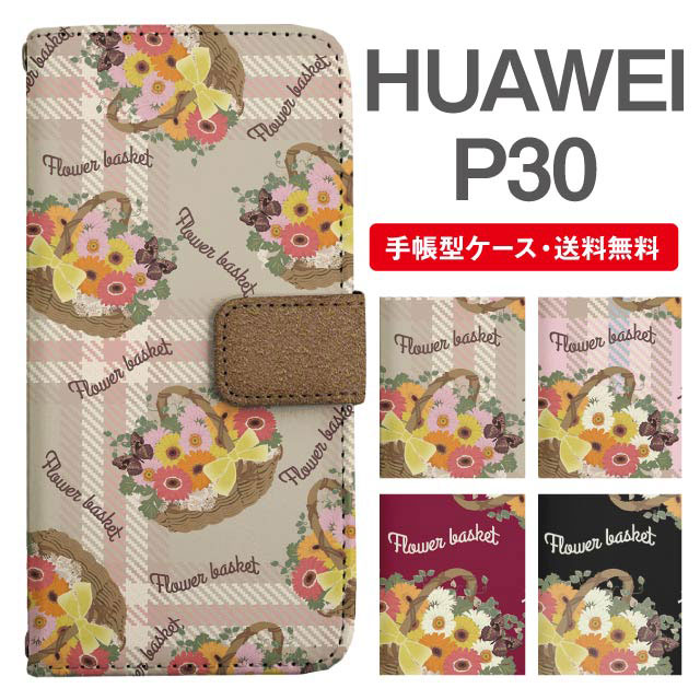 スマホケース 手帳型 HUAWEI P30 ファーウェイ 携帯ケース カバー 送料無料 花柄 フラワーバスケット チェック agesugi_ssm
