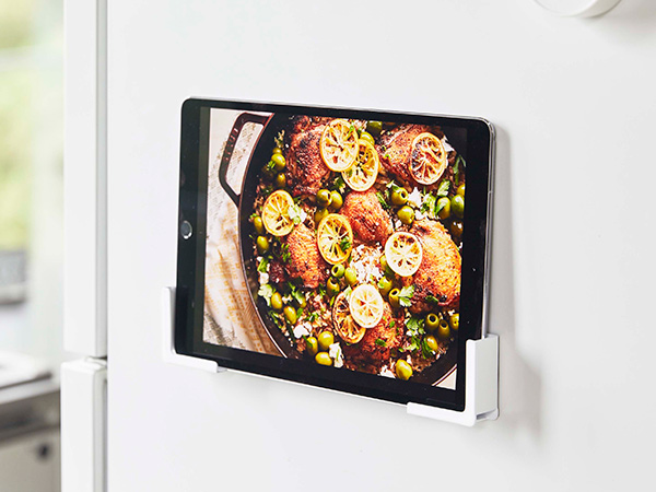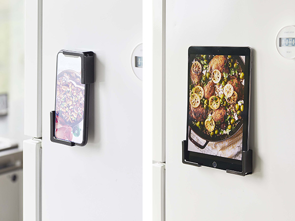調理台やカウンターに置くと邪魔なり汚れが心配なタブレット。音楽を聴いたり、アプリでレシピを見ながらお料理したりとキッチンでも使いたい時に便利なマグネットタブレットホルダーです。冷蔵庫の見やすい使いやすい位置に付けることで場所を取らずサッと操作できます。