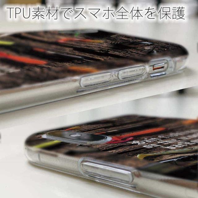 | ケースの素材について | 側面はゴムのように柔らかいTPU素材で、スマホ本体を守ります。万が一の落下でもケースが割れることがなく、耐久性の高いケースとなります。クリア(透明)のTPUケースにプリントしていますので、スマホ本体のカラーを活かしながらデザインケースが楽しめます。 |