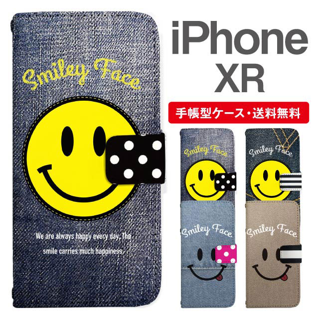 スマホケース 手帳型 iPhone XR アイフォン 携帯ケース カバー 送料無料 スマイリー スマイル ニコちゃん デニム柄 フェイクデザイン agesugi_ssm