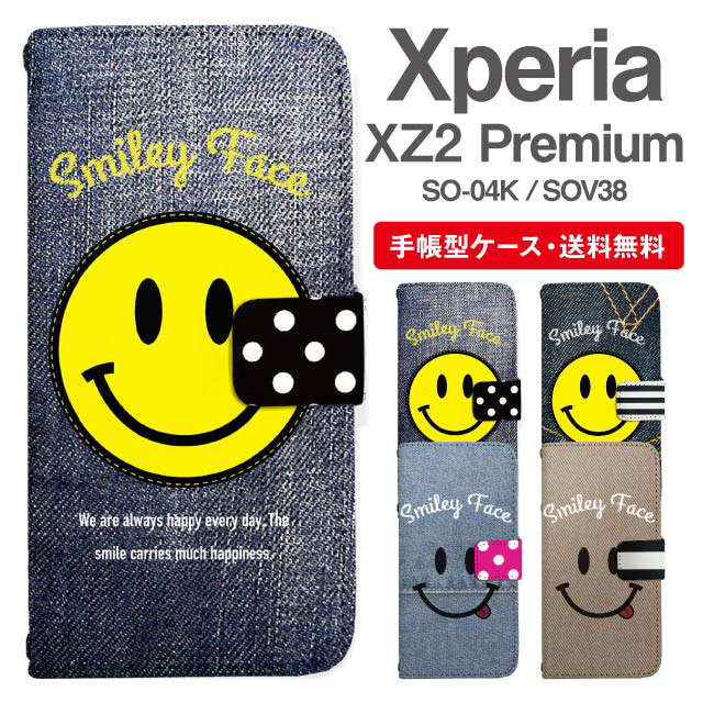 スマホケース 手帳型 Xperia XZ2 Premium エクスペリア SO-04K SOV38 携帯ケース カバー 送料無料 スマイリー スマイル ニコちゃん デニム柄 フェイクデザイン agesugi_ssm