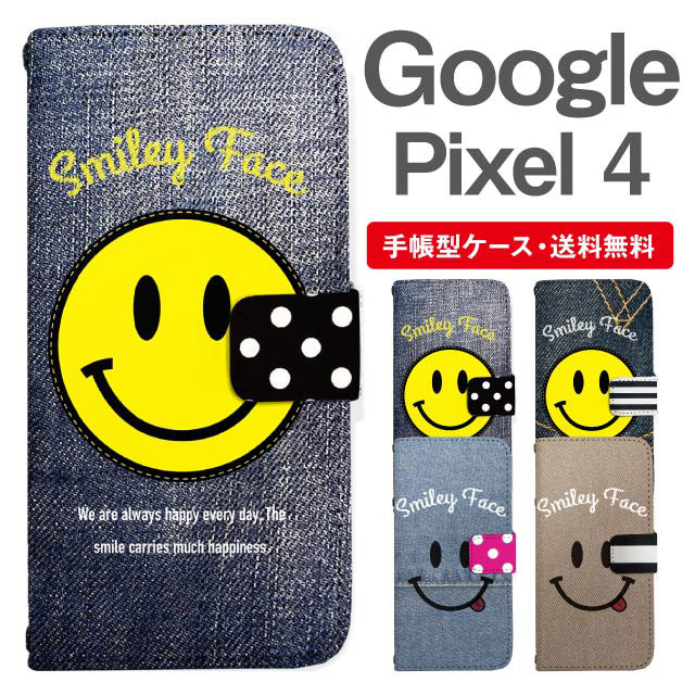 スマホケース 手帳型 Google Pixel4 グーグル ピクセル 携帯ケース カバー 送料無料 スマイリー スマイル ニコちゃん デニム柄 フェイクデザイン agesugi_ssm