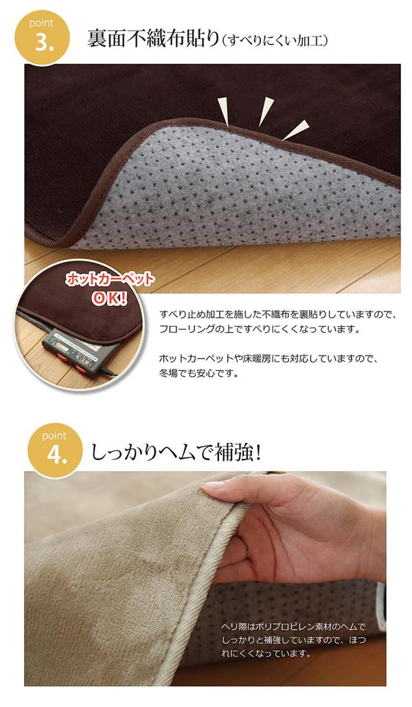 | 生地に抗菌・防臭加工を施したラグカーペットです。しっとりとして非常に柔らかいフランネル生地を使用しています。春夏はラグとして、冬場はホットカーペットカバーとして、オールシーズンご使用いただけます。 |