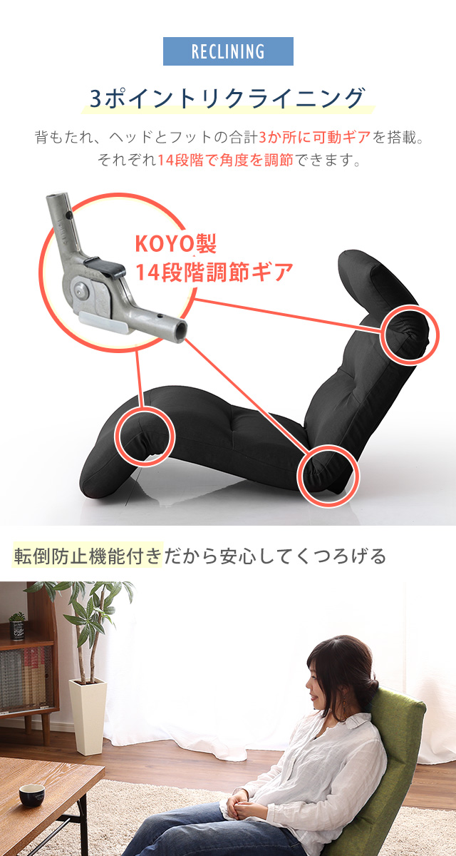 - 座り心地も良く、3か所ついてる、リクライニングもとても良いです。作りも生地も丈夫で、長く使えそうです。