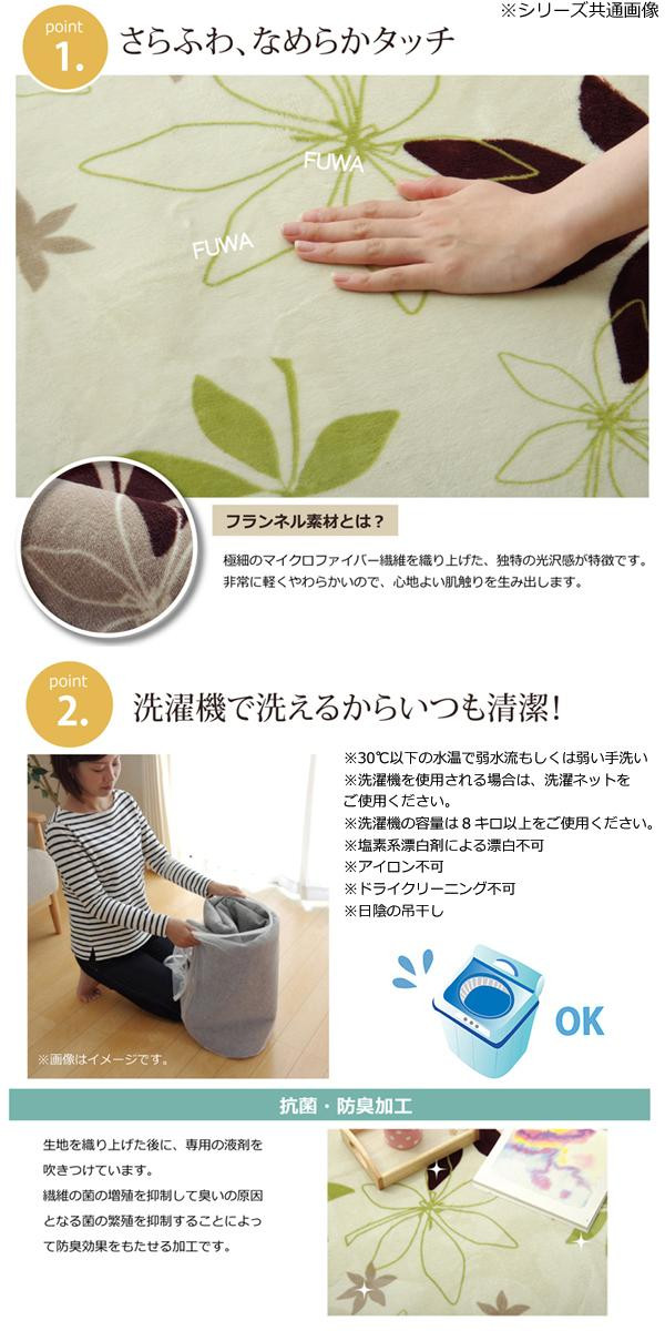 | 生地に抗菌・防臭加工を施したラグカーペットです。しっとりとして非常に柔らかいフランネル生地を使用しています。春夏はラグとして、冬場はホットカーペットカバーとして、オールシーズンご使用いただけます。 |