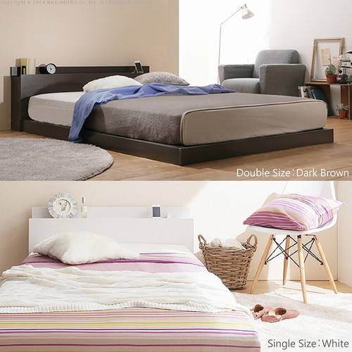 商品について:【マットレスがセットになった宮棚付きフロベッド】フレームと床面がフラットなためベッドメイキングが楽にできます。棚にはホコリ侵入防止用のフタが付いた2口コンセント(1500W)。マットレスは理想の寝姿勢を保つポケットコイルスプリング構造です。