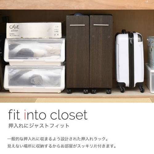 キャスター付きの便利な押入れラック2個組。取っ手はどちらにも取り付け可能なので、収納箇所の向きは左右入れ替えできます。本やメディア類や、日用品のストックまで、押入れ内のスペースを有効活用するのでお部屋をすっきり片付けられます。