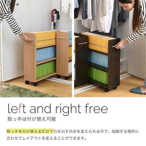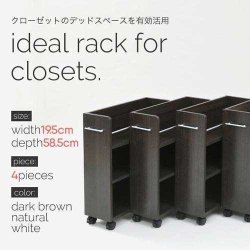 キャスター付きの便利なクローゼットラック4個組。取っ手はどちらにも取り付け可能なので、収納箇所の向きは左右入れ替えできます。本やメディア類や、日用品のストックまで、クローゼット内のスペースを有効活用するのでお部屋をすっきり片付けられます。