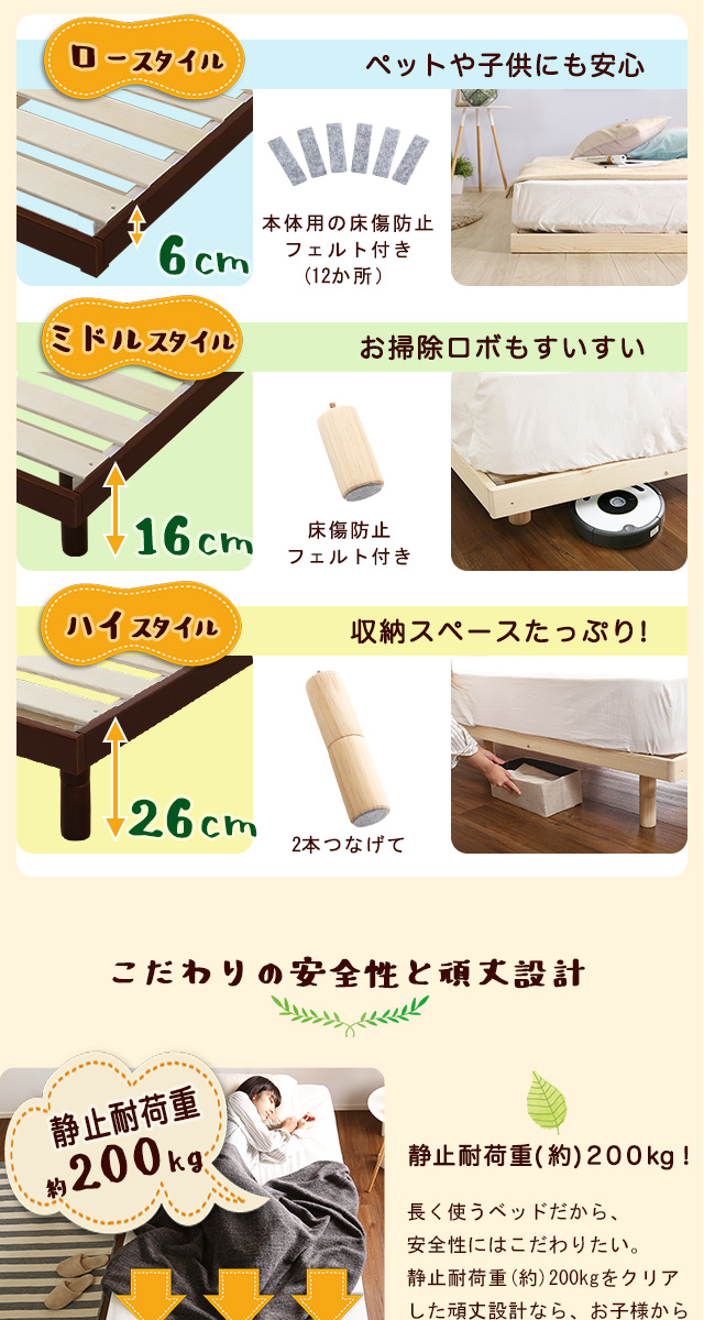 あす着 シングルベッドフレーム ベット おしゃれ 安い 北欧 1人 一人暮らし ローベッド ロータイプ フロア 低い すのこ 通気性 除湿 カビ 床下 収納 高さ調整 高さ調節 脚付き ルンバ 布団を敷ける マットレスなし ショート 小さめ ナチュラル ブラウン ホワイト 白 激安