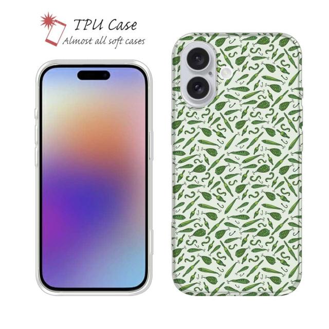 ソフトケース iPhone17 Pro Max iPhone Air クリアケース iPhone16e Pro Max iPhone15 Pro Max iPhone14 Plus iPhone13 mini Xperia 10 VII Galaxy AQUOS sense arrows Pixel10 Pro XL 釣り 魚 ルアー セット TPU 透明 釣具のシームレスパターン グリーン