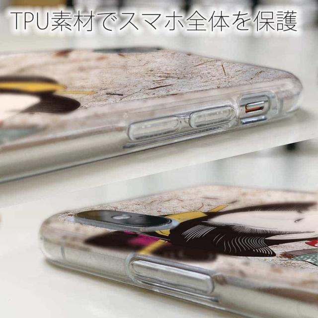 | ケースの素材について | 側面はゴムのように柔らかいTPU素材で、スマホ本体を守ります。万が一の落下でもケースが割れることがなく、耐久性の高いケースとなります。クリア(透明)のTPUケースにプリントしていますので、スマホ本体のカラーを活かしながらデザインケースが楽しめます。 |