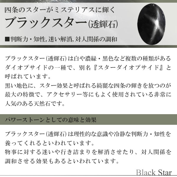 ブラックスター(透輝石)は理性的な意識や冷静な判断力・知性を養ってくれるといわれています。
