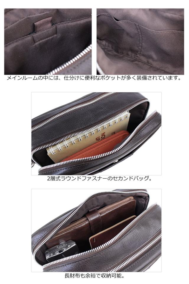 ナチュラルな表情の牛革を使用し、優れたコストパフォーマンスを実現した 2層式ラウンドファスナーのセカンドバッグ。