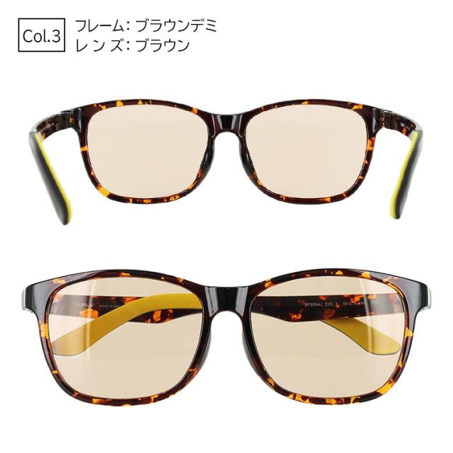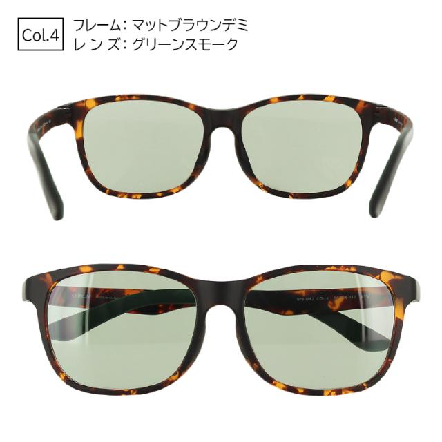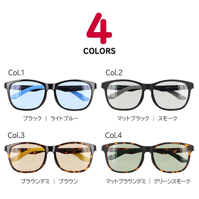 | Col.1 フレーム:ブラック レンズ:ライトブルー Col.2 フレーム:マットブラック レンズ:スモーク Col.3 フレーム:ブラウンデミ レンズ:ブラウン Col.4 フレーム:マットブラウンデミ レンズ:グリーンスモーク | ●素材 フレーム:プラスチック テンプル:プラスチック レンズ:プラスチック ●機能 UVカット |
