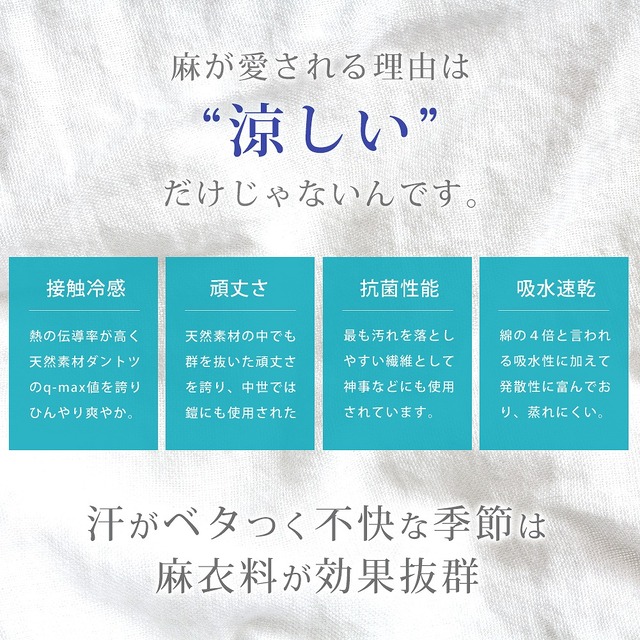| (本体)レーヨン45% 麻65%/ポリエステル40% 麻20% レーヨン30% 綿10%(生産時期によりレーヨン45% 麻65%のもものがございます。) |