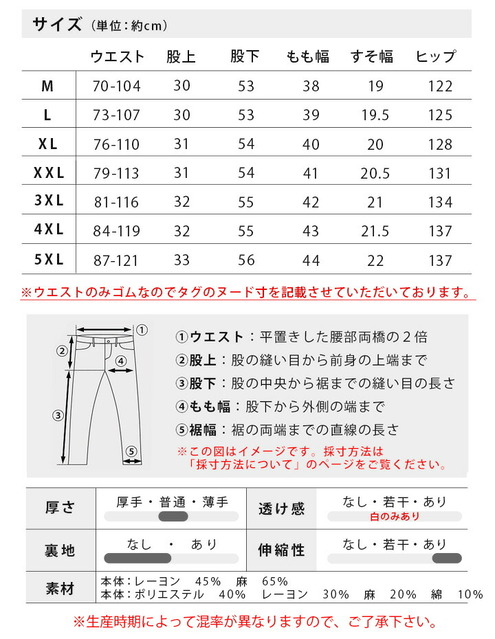 | サイズ | ウエスト | 股上 | 股下 | もも幅 | 裾幅 | ヒップ |
