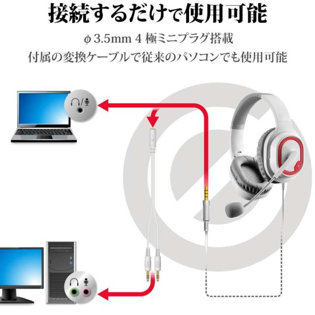 ●φ3.5mm 3極ミニプラグ*2(マイク*1、ヘッドホン*1)の変換ケーブルが付属していますので、4極ミニプラグのヘッドセット端子を搭載していない従来のパソコンでも使用可能です。