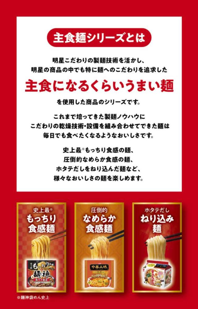 ●麺:ホタテエキスをねり込み、スープとの一体感を強化した歯切れよく食べやすいフライめん。