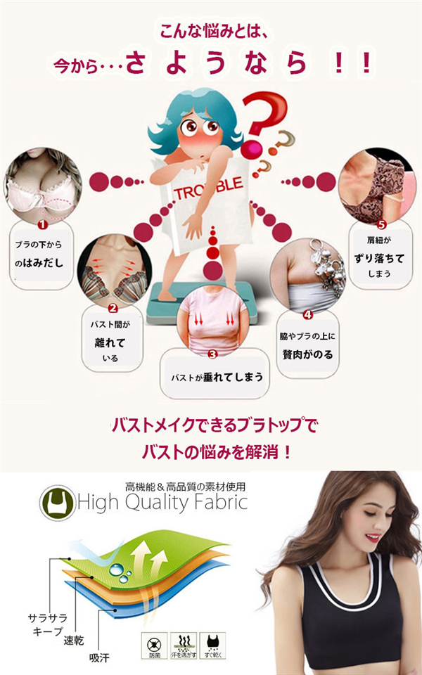 | 商品特徴 | 身体にスムーズにフィットし、筋肉疲労を緩和!★ 1,丸編み製法★ 「丸編み」はボディを縫い目のない筒状に編み立てることで、シームレスを実現。 肌あたりソフトで、アウターに響きにくく、 体にほどよくフィットしてずれません。 2,吸汗速乾生地★ 汗をかいたら、素早く吸収、そして放出できる生地使用。 3,安心のダブルレイヤー★ 汗染みが表面に出にくい2重仕立て、裏地がついてるからとてもしっかりしています。 4,バストメイクできる★ 素材の伸縮性でバストメイクするノンワイヤーブラ。しかも出し入れできるパッドポケット付きでお好きなパッドと交換していただけます。 5,バストが安定する★ 激しい動きでも、バストの揺れを防ぎ、バストの形が崩れたり、垂れたりするのを防ぐ、ボールド感をキープ。 抗菌効果でいつも清潔で安心 ★ 肌触りの良い柔らかい素材 ★ 絶妙なフィット感でずれない。 ★ 女性らしい美しいシルエット。 ★ 出し入れ自在のパッドポケット付き。★ パッドは付属していますが、お好きなパッドと入れ替えることもできます。 ★ 肩や背中のあいたトップのインナーにも◎★ |