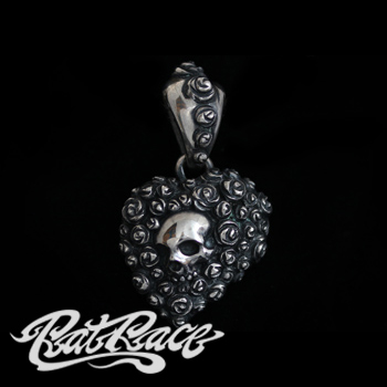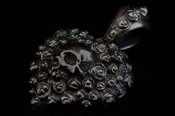 ハート型に敷き詰まった複数のバラの花にスカルが囲まれたペンダントトップ。