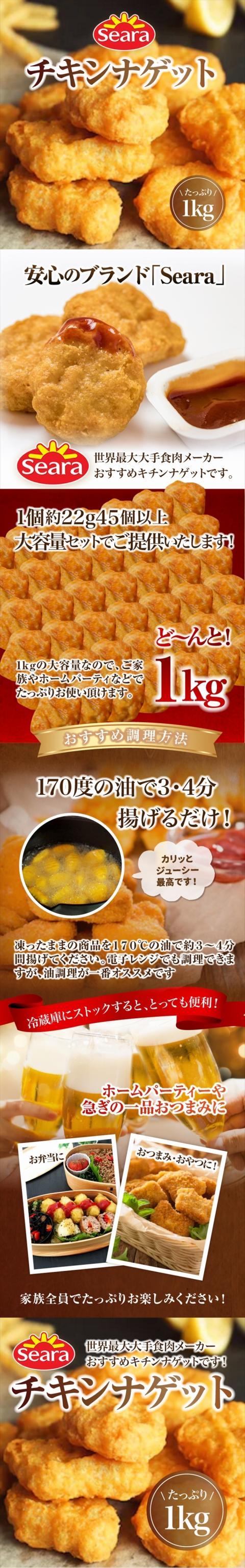 auスマートパスプレミアム会員様は必ずお読みください■安心のブランド商品です■。世界最大手食肉メーカー『SEARA』のチキンナゲットです1個約22gの大きさです凍ったままの商品を170℃の油で約3〜4分間揚げてください。電子レンジでも調理できますが、油調理が一番オススメです