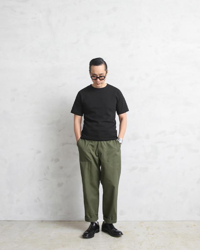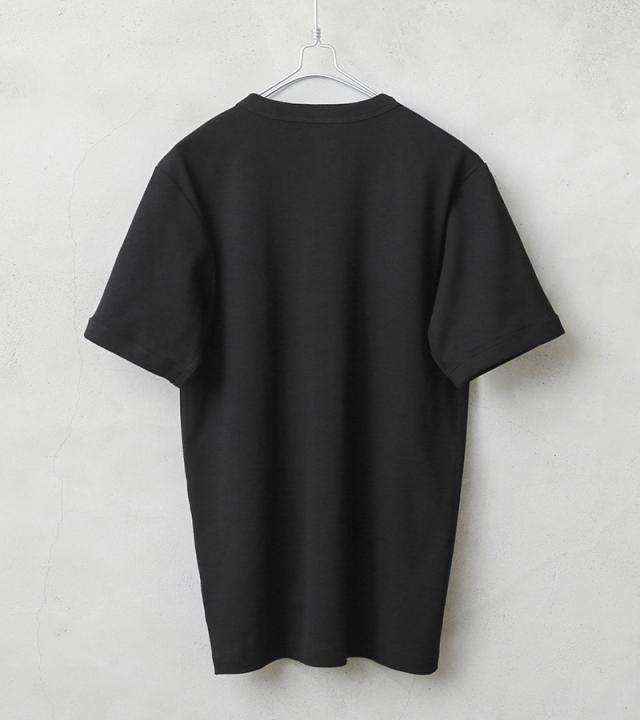 柔らかくストレッチ性のあるリブ素材、タグは背中に違和感を与えないため熱転写でプリントしたTAGLESS(タグレス)仕様、そして脇縫いは肌に不快感を与えないためのフラットシームなど着心地の良さにこだわっています。スパンデックス混のタフな肉厚生地なので、洗いこんでも首回りが伸びにくく、耐久性も優れてます。
