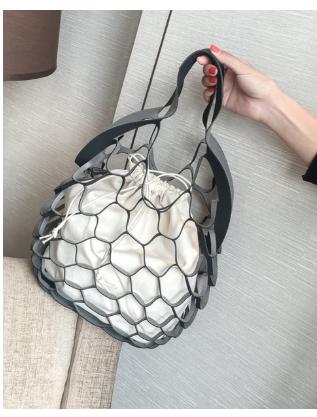 あみ状のバッグはコンパクトにたためる事が出来るので収納などに場所をとりません! 中に入っている布バッグは丈夫な帆布で出来ておりスナップボタンでメッシュバッグの上の方に固定する作りになっているのでズレ防止になり持ち歩いても中で布バッグだけがぺしゃんと潰れて残念なことにならずおしゃれさをキープします。