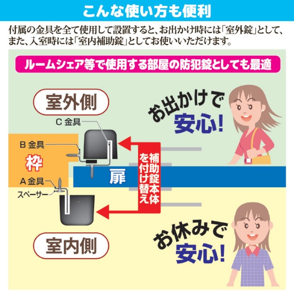 内側からでも外側からでも施錠できる補助錠!●キータイプだから扱いやすい●ピッキングによる開錠がされにくいディンプルキーを採用●ルームシェア等でのお部屋の防犯錠としても最適●防犯対策としての「防犯錠」は種類も多く、ニーズの変化にも対応した新しい防犯錠が出てきてます。●本製品は、そんな現代のニーズを反映したドア用補助錠です。●金具をネジ止めする手間はありますが、外開きドア、内開きドアのどちらでも使用ができます。●また、付属金具を全て使用し、扉の外側からでも内側からでもロックすることが可能です。●お出かけの時は「室外錠」として、入室時には「室内補助錠」として使い分けができ、ルームシェア等で使用される場合のお部屋の防犯錠としても最適です。●鍵はピッキング被害に強いとされるディンプルキーを採用してます。