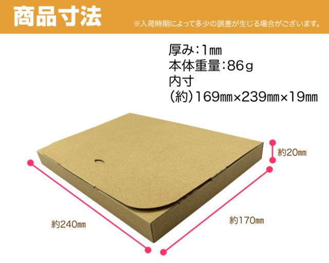 | 商品仕様 | 宅配サイズ:A5サイズ サイズ(約): ・外寸:幅240×奥行170×高さ20mm ・内寸:幅239×奥行169×高さ19mm 厚さ(約):1mm 重量(約):86g カラー:両面 クラフト色 |