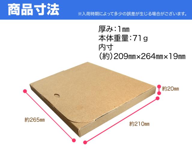| 商品仕様 | 宅配サイズ:B5サイズ サイズ(約): ・外寸:幅265×奥行210×高さ20mm ・内寸:幅264×奥行209×高さ19mm 厚さ(約):1mm 重量(約):71g カラー:両面 クラフト色 |