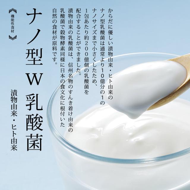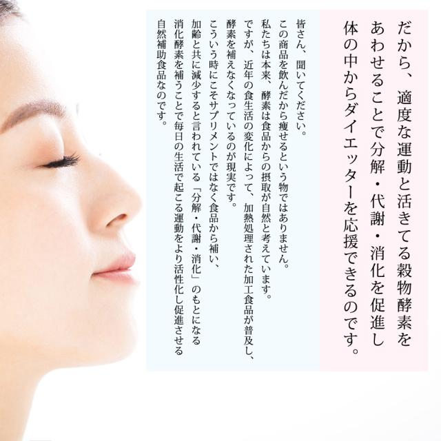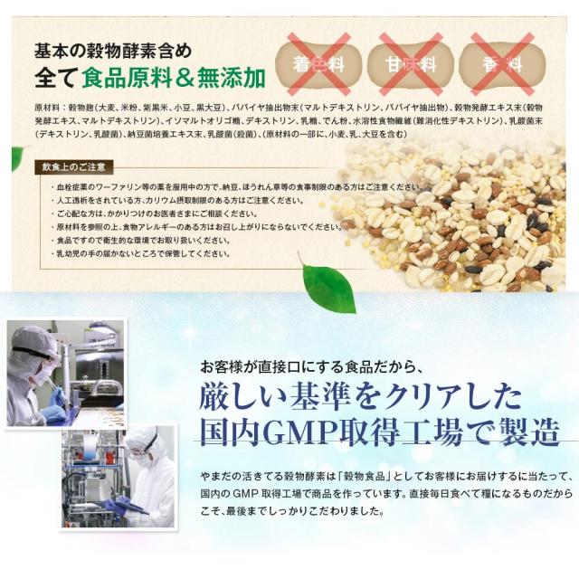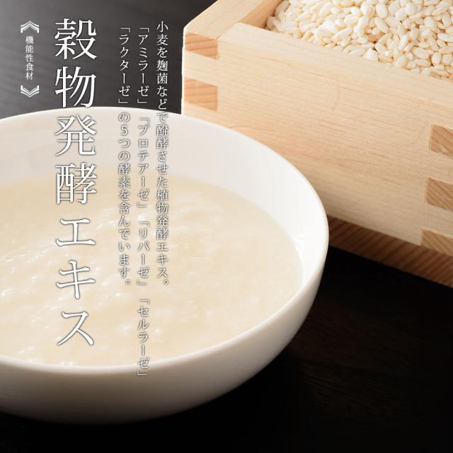 穀物麹(大麦、米粉、紫黒米、小豆、黒大豆)、パパイヤ抽出物末(マルトデキストリン、パパイヤ抽出物)、穀物発酵エキス末(穀物発酵エキス、マルトデキストリン)、イソマルトオリゴ糖、デキストリン、乳糖、でん粉、水溶性食物繊維(難消化性デキストリン)、乳酸菌末(デキストリン、乳酸菌)、納豆菌培養エキス末、乳酸菌(殺菌)、(原材料の一部に、小麦、乳、大豆を含む)