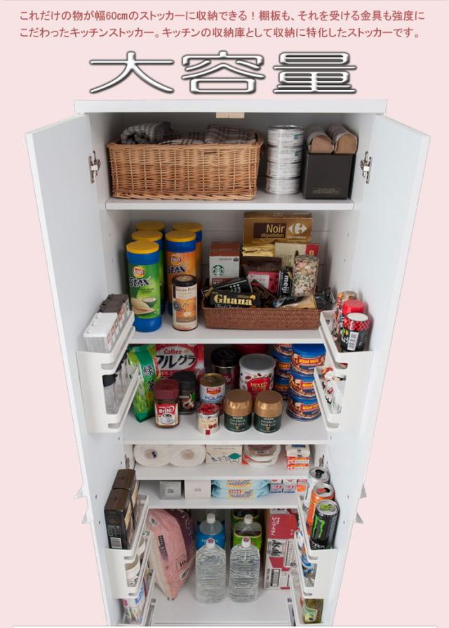 ■商品について/艶のあるすっきりフェイスの大容量キッチンストッカー。キッチン廻りの必需品を、大量にストック。ごちゃごちゃした物は板扉のストッカーで綺麗に隠す。
