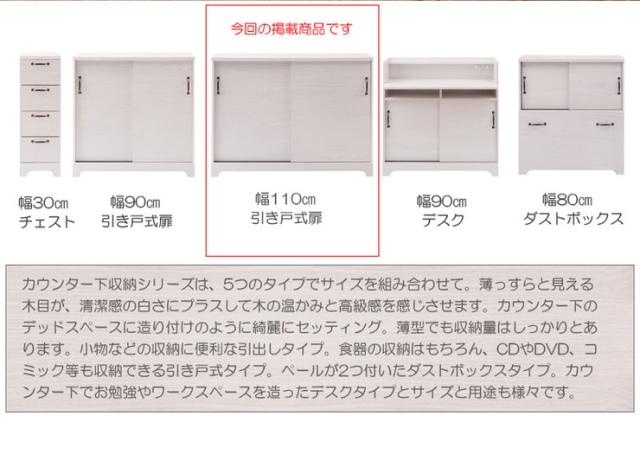 ■商品について/うっすら木目を生かしカントリーチックに仕上げたカウンター下シリーズ。鉄製トランク取っ手、アーチ状の台輪部など、細部にこだわったお洒落なシリーズ。省スペースで使える引戸式扉で、限られた空間に収納機能を凝縮。カウンター下やリビングなど様々なシーンで活躍する薄型キャビネットは幅90、120にダストボックスまで取りそろえ、インテリア度アップ。ゴミ箱が入っているとは思えないダストカウンターはリビングでも活躍。