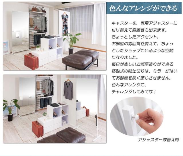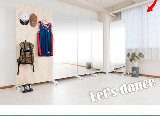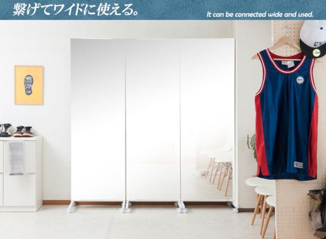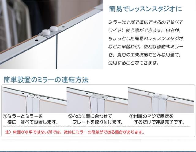 ■商品について/簡単に移動ができる大型ミラー。裏面も綺麗に仕上げて間仕切りにもなるのが嬉しい。ミラーは上部で連結できるので並べてワイドに使う事ができます。自宅が、ちょっとしたレッスンスタジオなどに早替わり。便利な移動式ミラーを、貴方の工夫次第で色んな用途で使用することができます。色んな工夫で上手に使う。移動式だから使わない時は間仕切ったり、目隠しにしたりして。見終わった後、使い終わればひっくり返して簡単に目隠しにできるのも嬉しい。